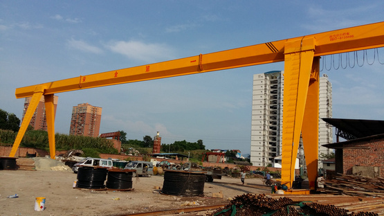 門式起重機是橋式起重機的一種變形。主要用于室外的貨場、料場貨、散貨的裝卸作業(yè)。它的金屬結(jié)構(gòu)像門形框架,承載主梁下安裝兩條支腳,可以直接在地面的軌道上行走,主梁兩端可以具有外伸懸臂梁。門式起重機具有場地利用率高、作業(yè)范圍大、適應面廣、通用性強等特點,在港口貨場得到廣泛使用。